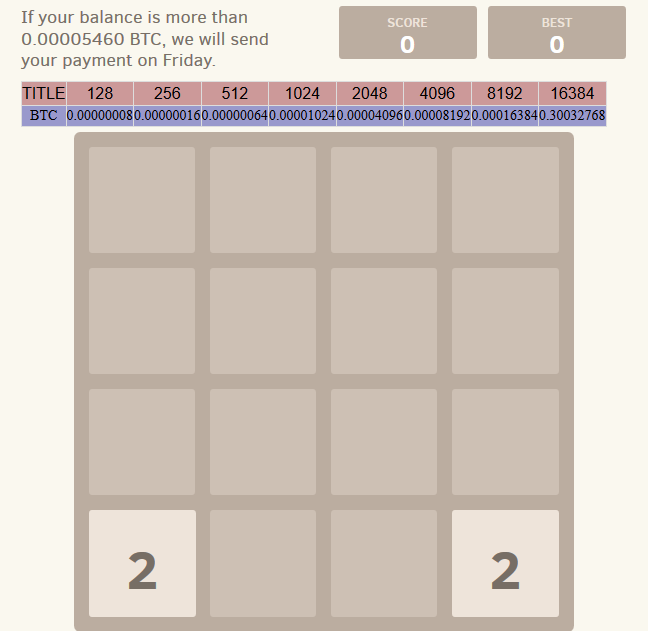 El bitcoin es una de las monedas más valoradas en el mercado, pero también la más volatil. El precio actual de un Bitcoin es de más de 300 dólares, el cual siempre está en constante cambio bajando y SUBIENDO DE VALOR. No esperes más y gana bitcoins gratis jugandoal 2048.
